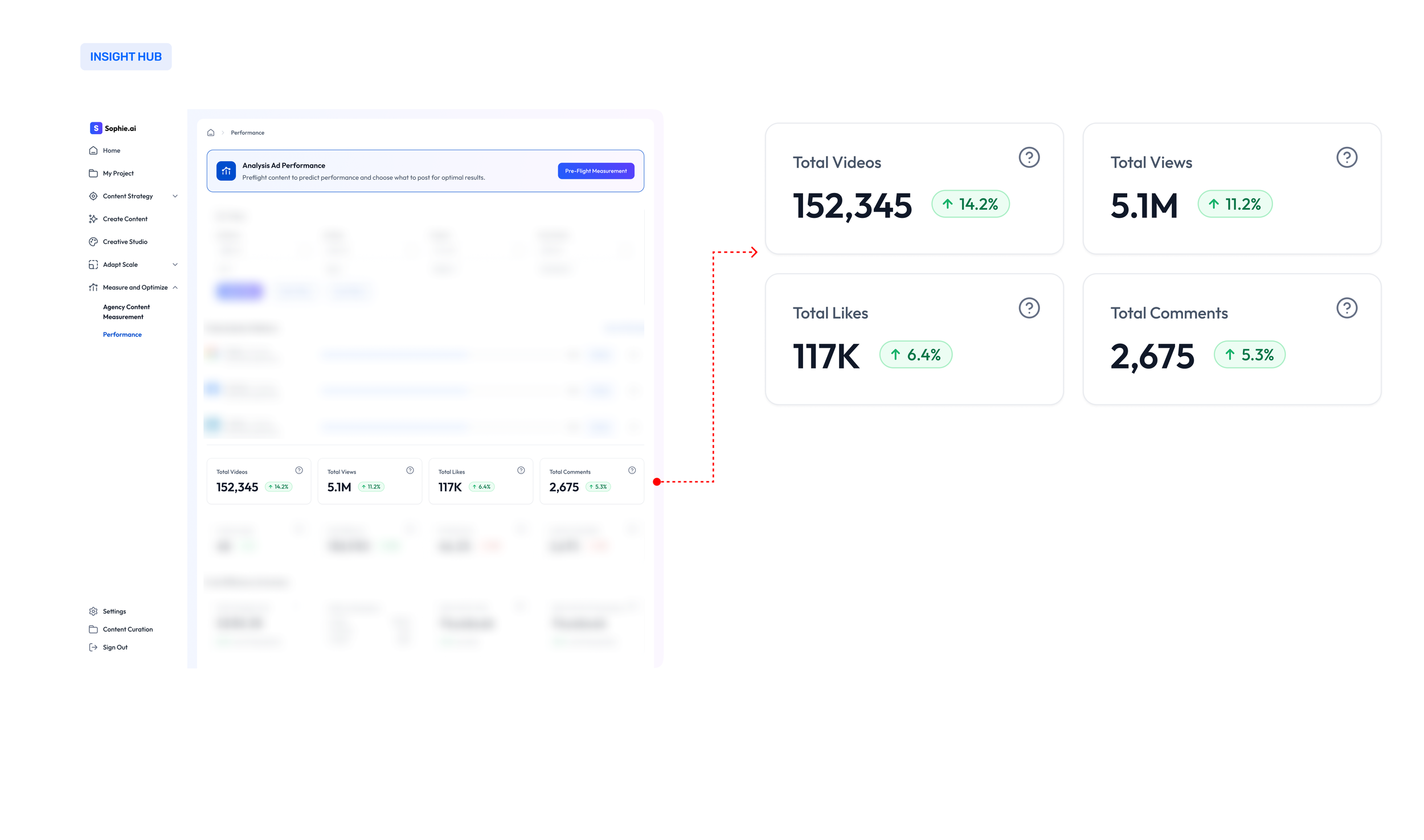 Winning Formulas and Generate Ideas form the creative core of Sophie. In parallel, Insight Hub focuses on performance measurement, giving users a clear view of how their influencer videos perform across platforms.