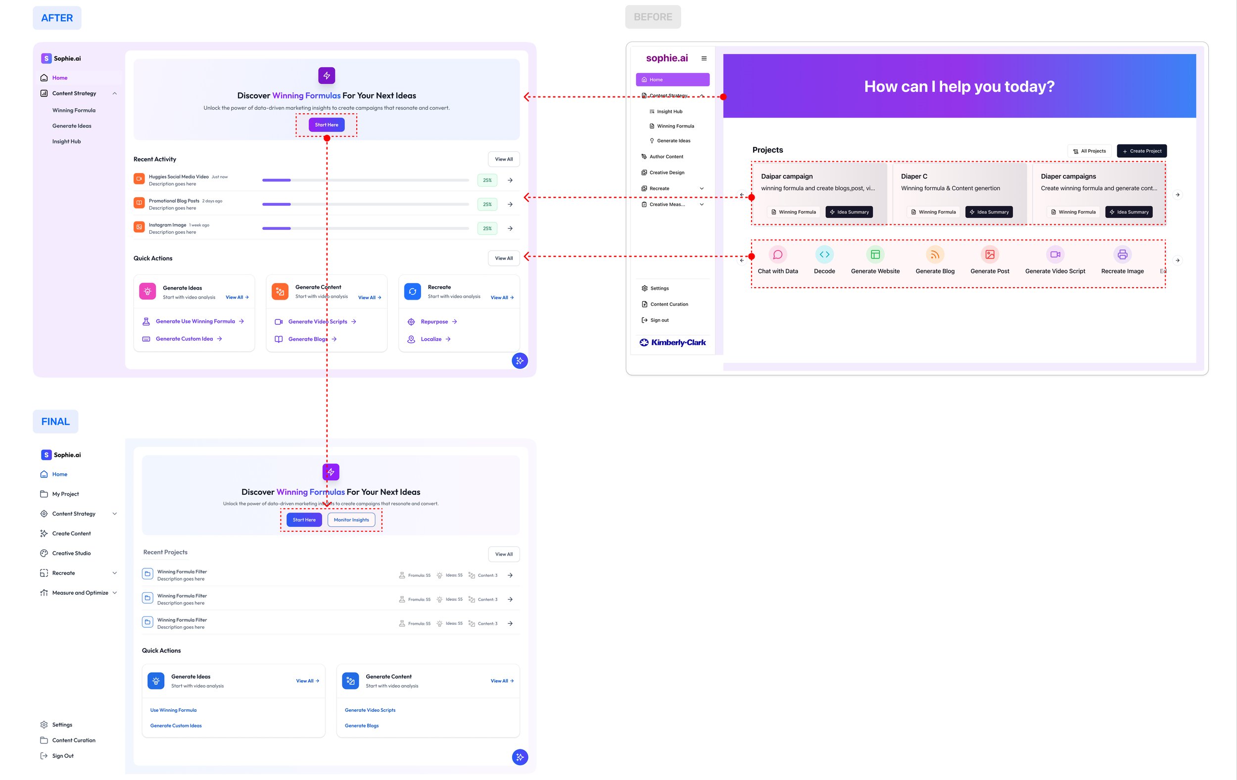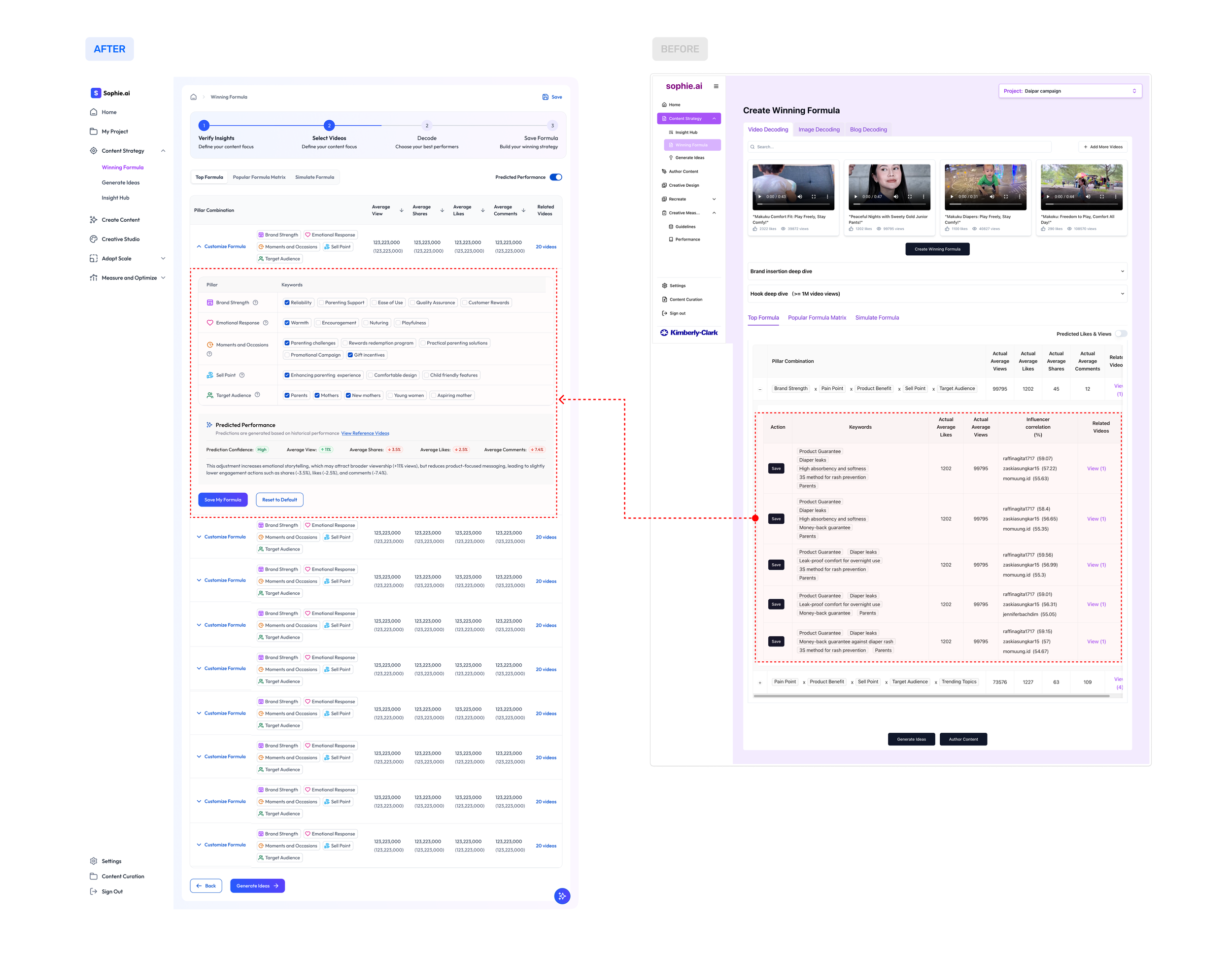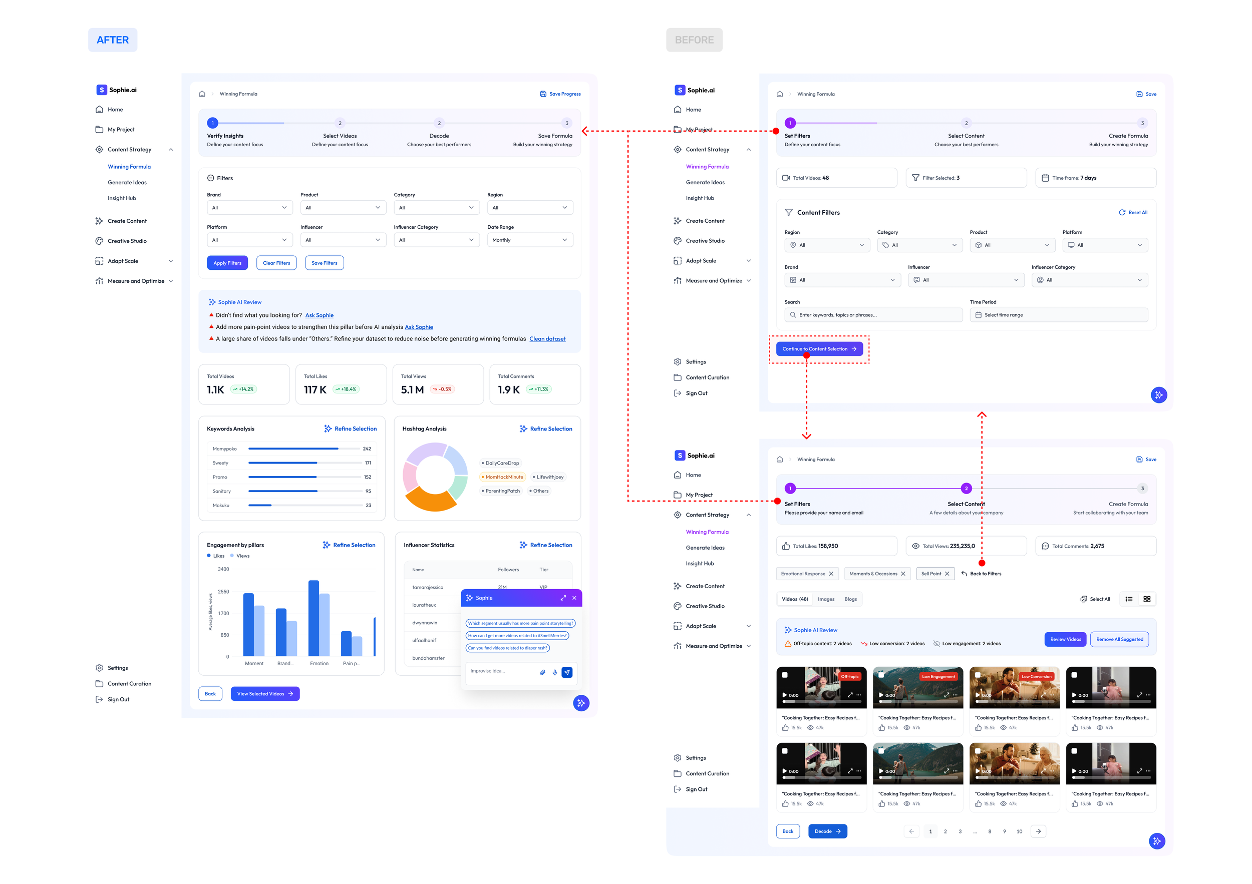 There are many repetitive and missing steps throughout the user journey when completing actions in Sophie. For example, the “Create Winning Formula” button is redundant—it creates unnecessary friction, as the winning formulas should appear automatically after decoding the videos.